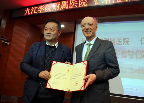 仪式上,校党委书记郑翔发表了热情洋溢的讲话。他说,我到九江学院工作后,经常想一个问题,全国大学有2000多所,新建本科院校有600多所,九江学院如何在短时间里崭露头角,赢得地位?我们党有一个好的传统,就是在敌强我弱的时候,在局部战场上形成优势,最后取得胜利。事情的道理是一样的。那么我校的局部优势要从哪里做起呢?两年前我们首先是抓特色教育,包括好习惯教育、国学素养教育和创业教育;其次是开展抢占学术制高点活动;第三就是柔性引进国内和国际高水平学术团队,与国内外高水平的专家教授合作形成我们的特色和优势。目前学校已经引进了三个高水平学术团队。前不久我们引进了德国音乐艺术家团队,将来有可能把国际声乐大赛引进到九江,之前这是不可想象的。这次我们引进了国际高端乳腺肿瘤一流团队,周永昌教授是亚洲在乳腺肿瘤治疗方面的一把手,Giuseppe Viale教授是欧洲在乳腺肿瘤治疗方面的一把手,还有两名日本著名教授,他们都是国际乳腺肿瘤治疗方面的著名专家。我们选择在局部进行高位嫁接,就有可能在短时间内形成别人也许用20年时间都无法赶上的优势。我们希望引进这个高水平的医疗团队,把九江地区乳腺肿瘤治疗带入一个高水平,希望九江地区兄弟医院的专家学者加入我们这个团队。今天的合作是一个开头,学校将办一个国际医疗算术研究所,目前世界上只有美国的哈佛大学、英国的剑桥大学才有这个研究所,我们是第三个。为了支持这个研究所,学校把南湖校区拿出来给研究所使用,将来以乳腺肿瘤治疗为起点形成我们的优势,这是学校的战略考虑。希望临床医学院/附属医院理解这个战略考虑,支持这个战略考虑,共同把这个研究所办好。