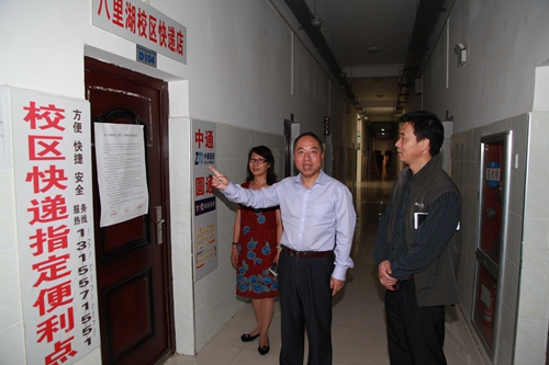 在检查过程中,甘校长还对图书馆八里湖校区分馆设立“心语心愿”毕业墙、图书漂流站,以及国学阅读、创业阅读和好习惯阅读书桌做法给予肯定。同时对学生公寓设立校区快递指定便利点的做法给予肯定,并希望其它校区学习他们的这种做法。