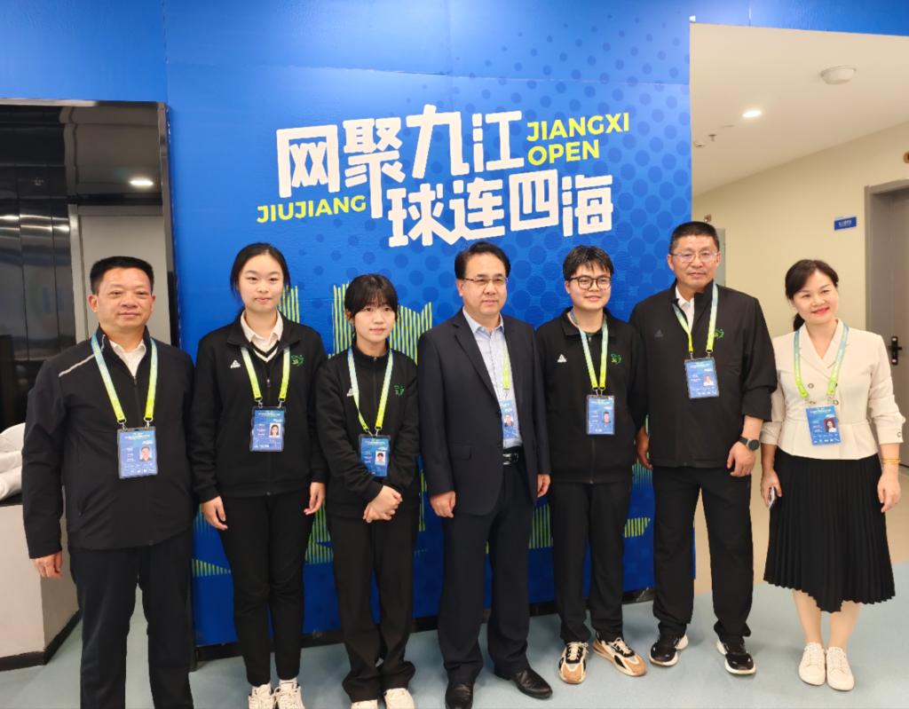 江西网球公开赛联合赛事总监沈红斌,九江市体育局党组书记、局长刘金梅,江西省体发公司相关负责人,以及我校党政办、团委、体育学院负责人等陪同。