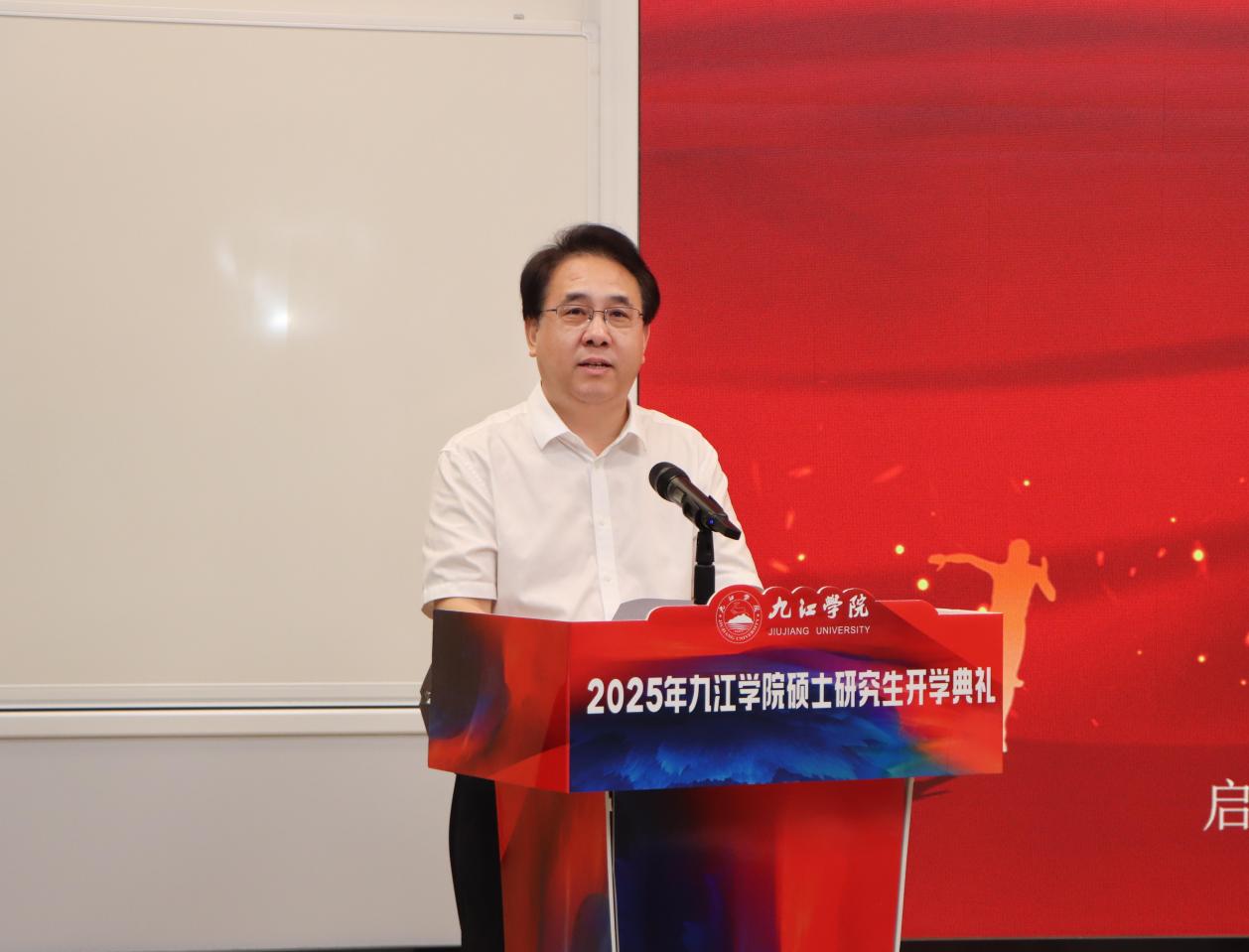 典礼上,李明斌首先向来自全国23 个省份、50 多所高校的新研究生表示欢迎,强调多元化的生源背景将为校园注入新的活力。在回顾学校办学历史时,李明斌指出,九江学院溯源于1901年创立的但福德医院护士学校,2002年由四校合并升格为本科高校,2024年成功获批硕士学位授予单位,生物与医药、资源与环境、国际商务三个学位点成为首批硕士授权专业。目前,学校正紧紧围绕更名大学的目标强化学科建设,已有10个学位点达到申硕条件,研究生教育体系日益完善。他还特别介绍了学校在科研与社会服务方面取得的显著成绩,包括荣获3项国家级行业科技奖、2024年以来科研与社会服务到账经费突破1亿元,并拥有重组后的省级重点实验室和10个国家级科技小院等高层次平台,为研究生学术研究与实战能力提升提供了坚实支撑。