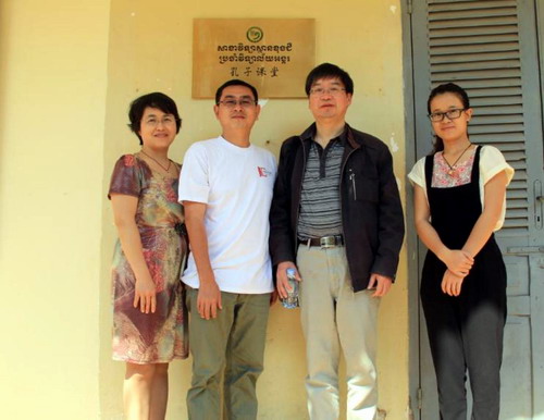 陈先平、宋春玲在肖荣老师的陪同下,来到吴哥高中孔子课堂。肖荣老师向来访嘉宾介绍了孔子课堂的有关情况,并对嘉宾的到来表示热烈欢迎。陈先平对吴哥高中孔子课堂的热情接待表示感谢。接着,宋春玲向大家详细了介绍了九江学院电子图书馆的使用方式方法及其他一些技术性问题。