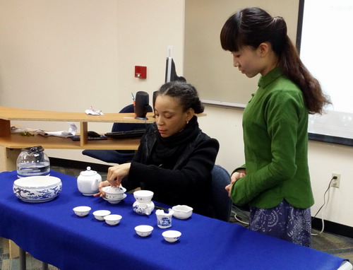 九江学院交换生席凯丽同学的茶艺表演和孔子学院张春子老师的解说让现场的外国朋友们对渊源流长的中国茶文化也有所了解。在场的观众都跃跃欲试,现场学习中国茶艺。