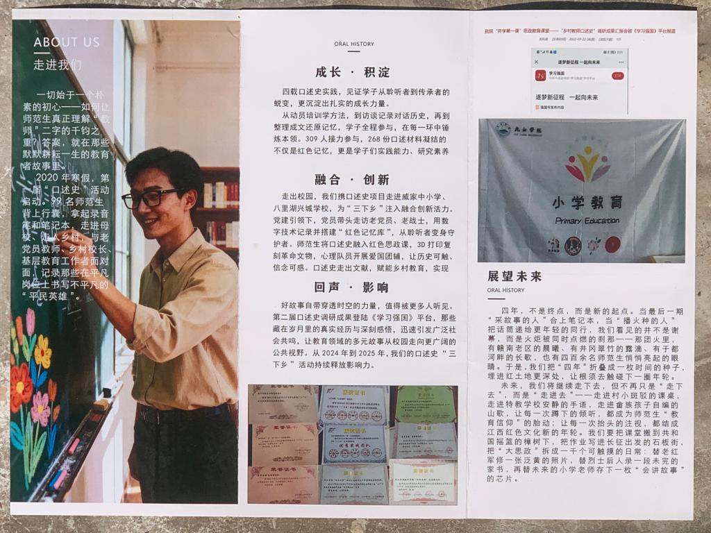 中国口述历史国际周作为国内外口述历史领域极具影响力的重要交流传播平台,已连续成功举办十届,该活动自2025年起正式升级更名为“中国口述历史国际展”,吸引了来自全球30多个国家和地区的业界专家、学者及相关机构深度参与,推动中国故事在全球学术语境中的创新表达。本次受邀参展,是对教育学院学生深耕教师教育、服务乡村振兴的充分肯定,更是激励其继续前进的力量。教育学院负责人表示,我们将继续以教育情怀对接国家需求,把更多“平民英雄”的故事带上更高平台,为教育强国建设贡献九江学院青春力量。