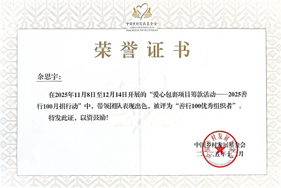 近日,2025年中国乡村发展基金会“善行100”月捐行动表彰大会圆满落幕。我校学生工作处(学生资助管理中心)指导的新长城九江学院自强社凭借突出的组织动员能力与扎实的公益实践,在全国高校公益社团中荣获全国第17名的优异成绩,充分展现了九江学院青年学子的责任担当与奉献精神。